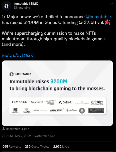 La start-up australienne Immutable vient d’annoncer sur son compte Twitter avoir réussi à récolter 200 millions de $ au cours d’une levée de fonds de Serie C.
