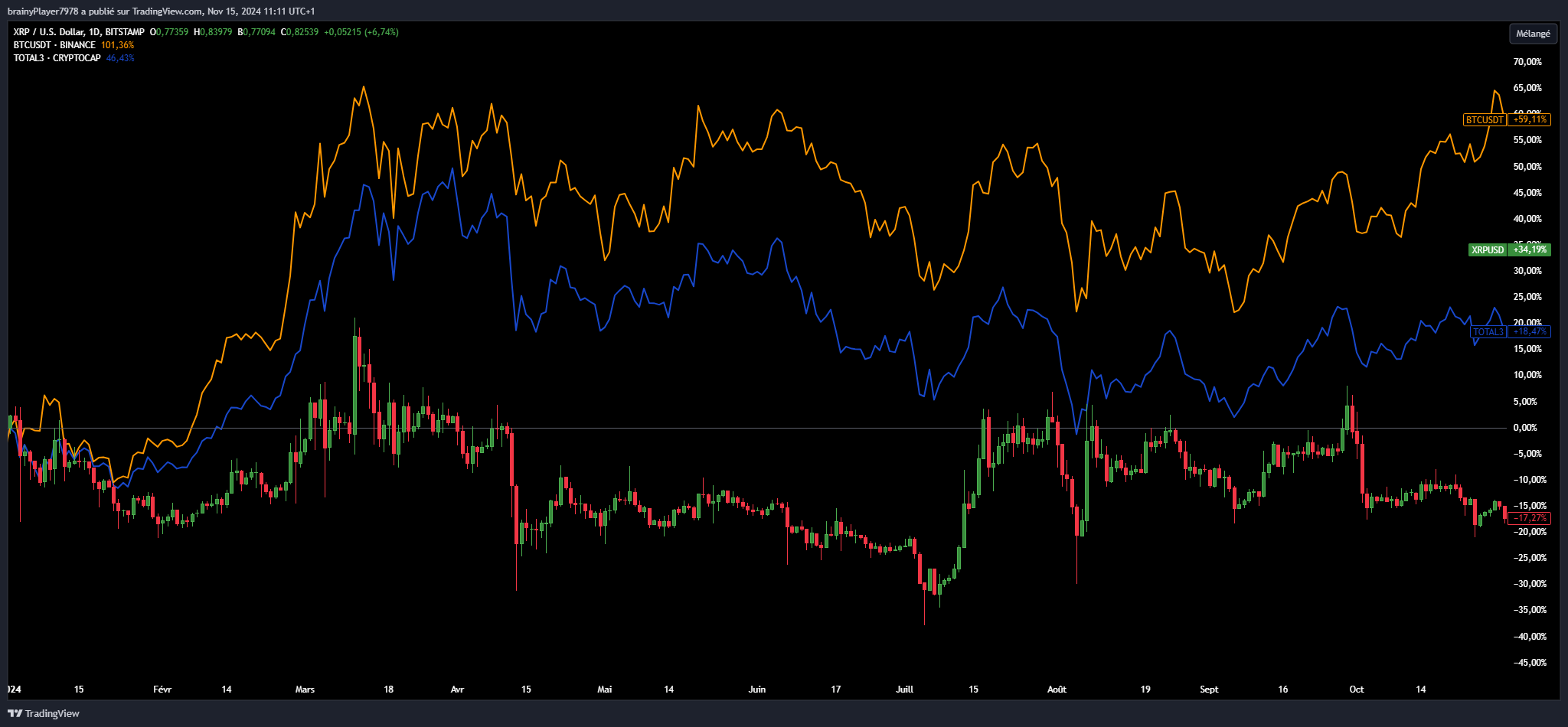 Entre le 1er janvier et le 31 octobre 2024, le token XRP avait enregistré une baisse de 17 %, tandis que Bitcoin progressait de +59 % et le TOTAL3 de +18,5 %.