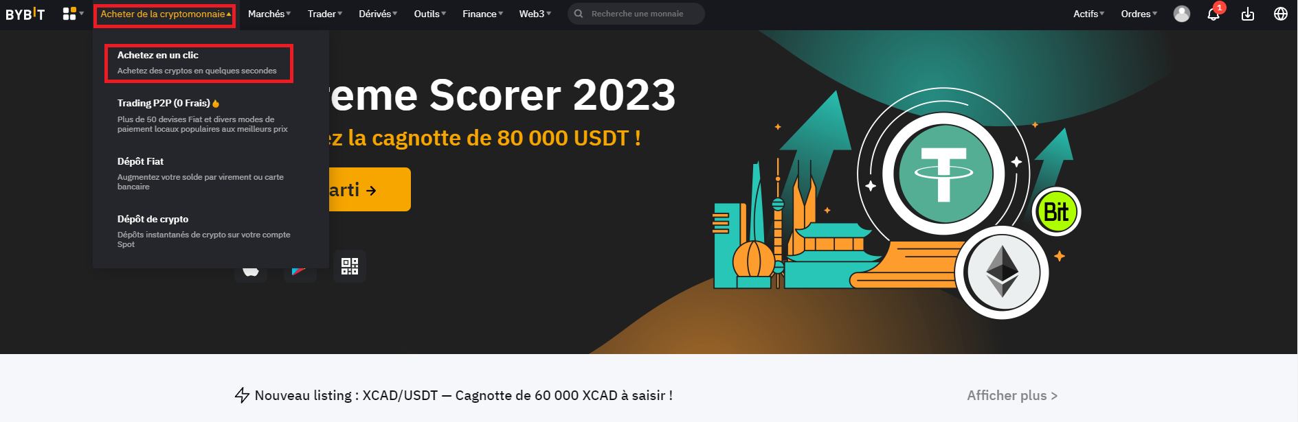 Une fois connecté, passez votre souris sur « Acheter de la cryptomonnaie » en haut à gauche de votre écran puis cliquez sur « Achetez en un clic ».